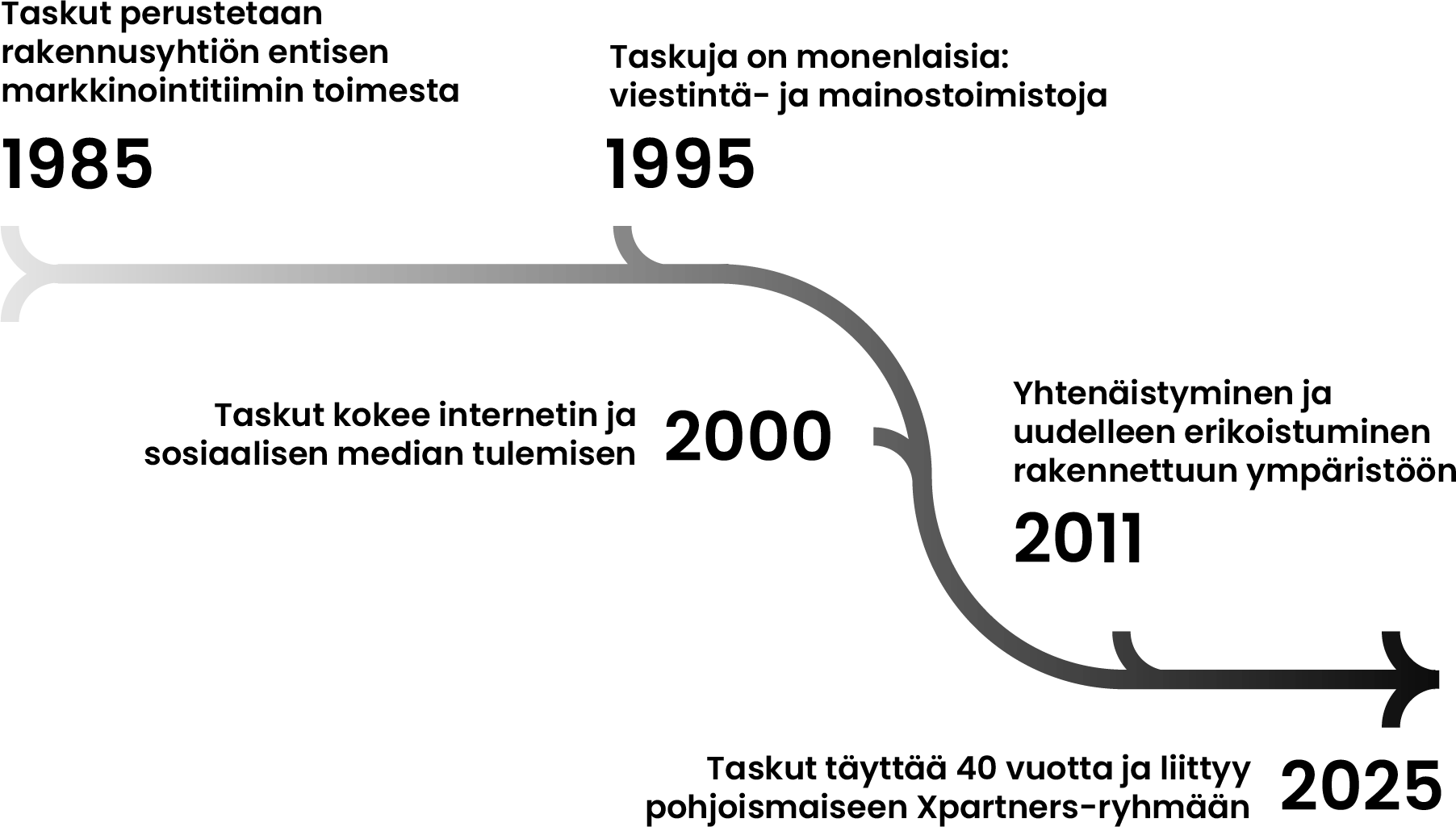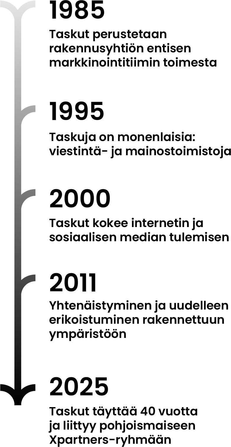 Taskut on Suomen ainoa kiinteistö- ja rakennusalaan erikoistunut viestintä- ja markkinointitoimisto. Jo 40 vuoden kokemuksella saat meiltä luovia ratkaisuja viestintään ja markkinointiin kaikissa muodoissa ja teknologioissa.